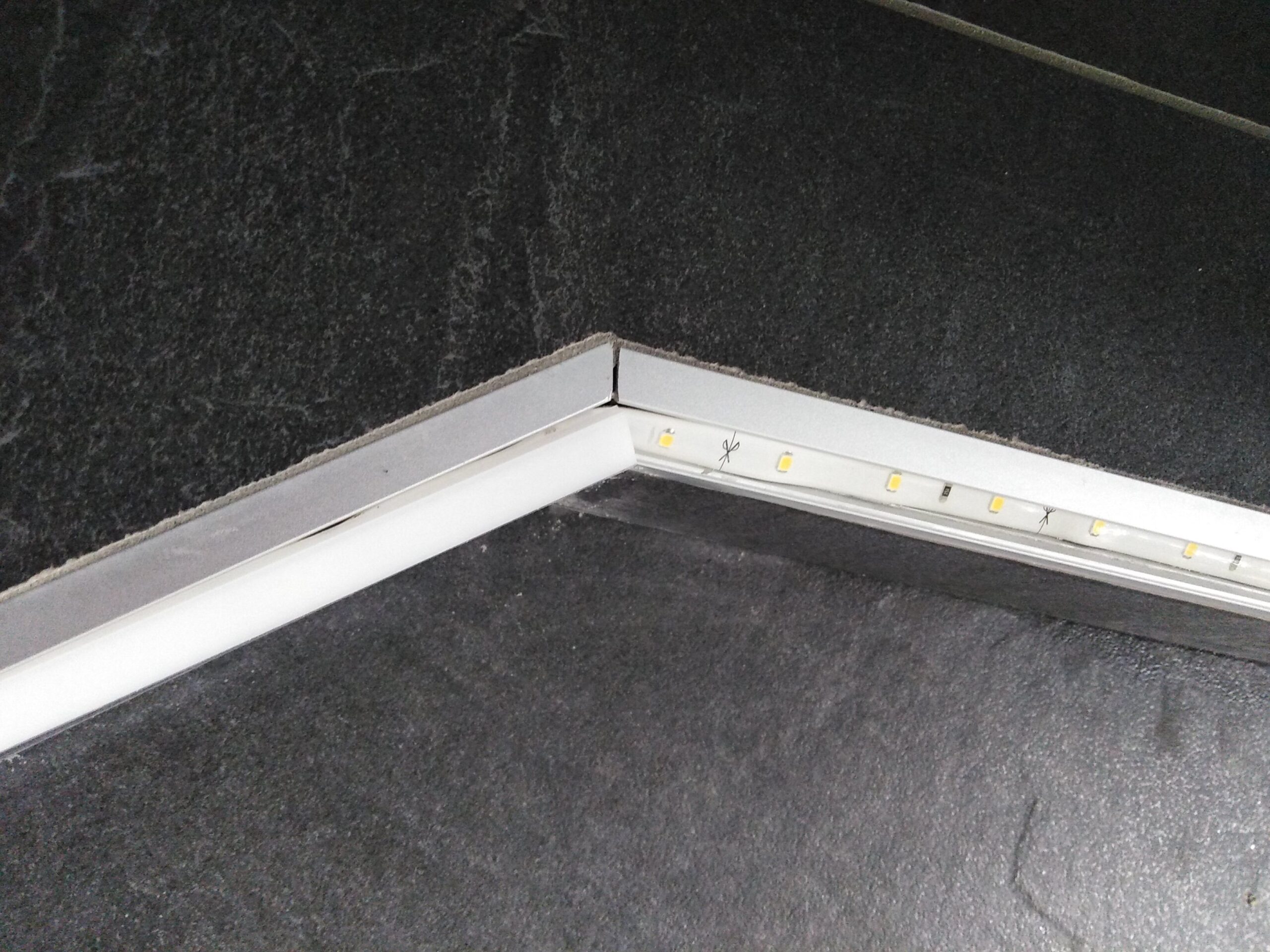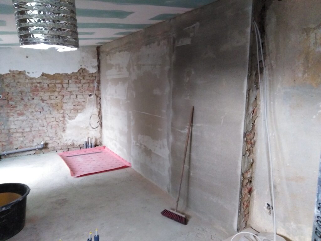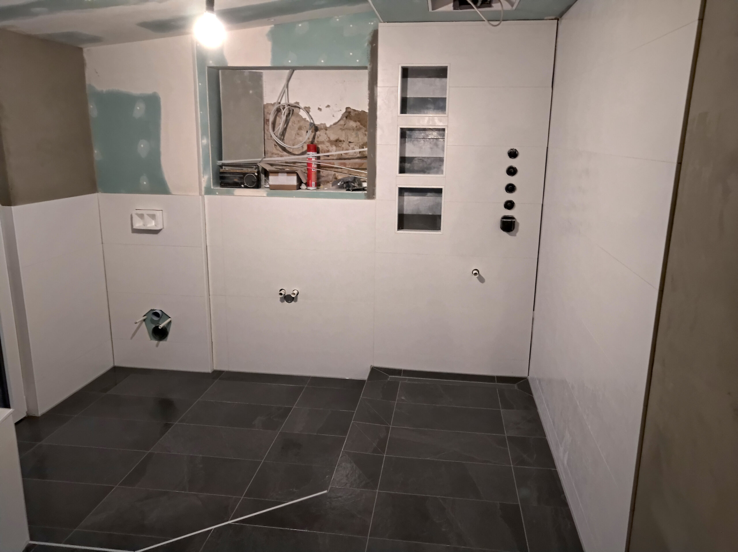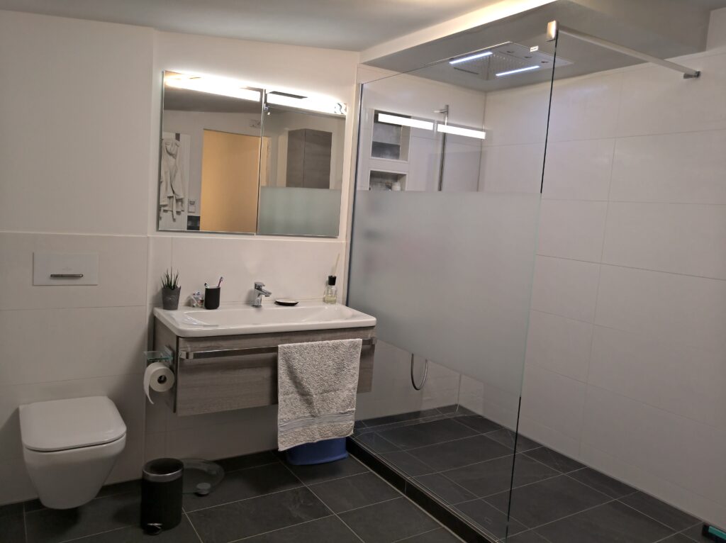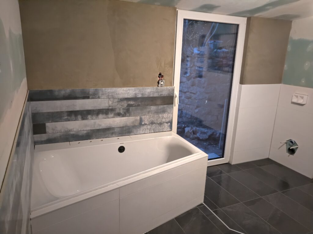 Der Estrich war fehlerhaft und musste aufwendig nachbearbeitet werden. Dabei entstand eine Stufe mitten im Raum – zunächst ein Problem, am Ende jedoch das gestalterische Herzstück des gesamten Bades.